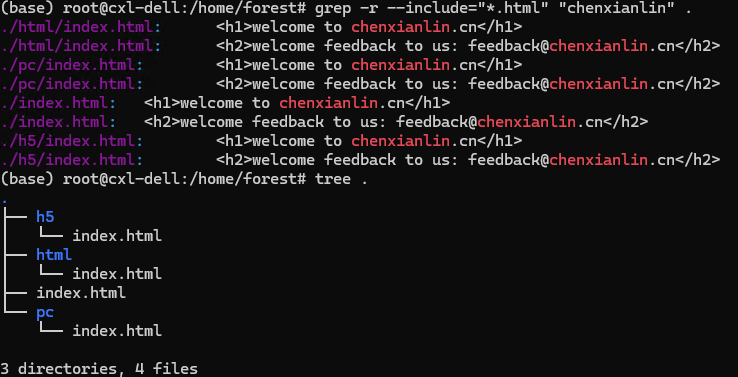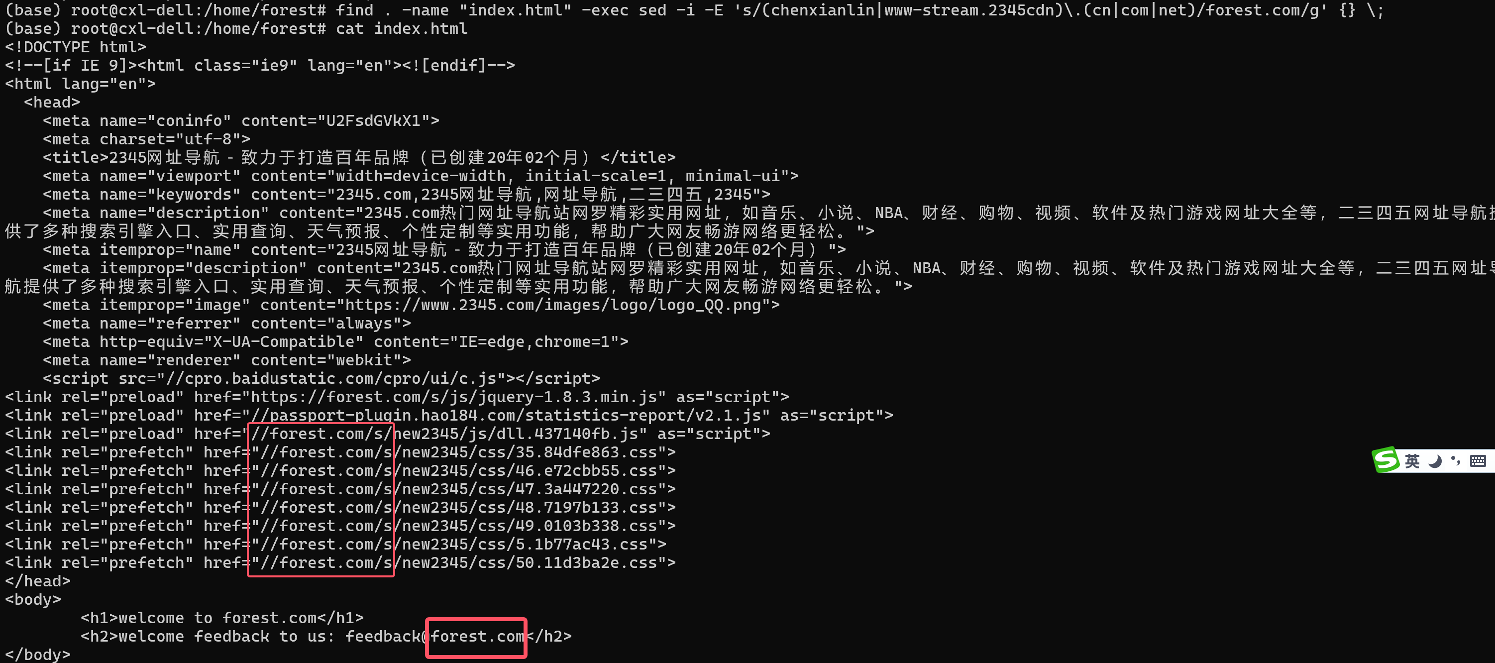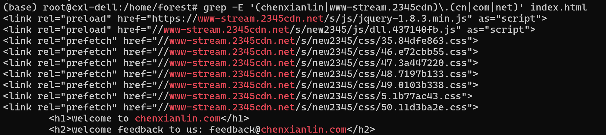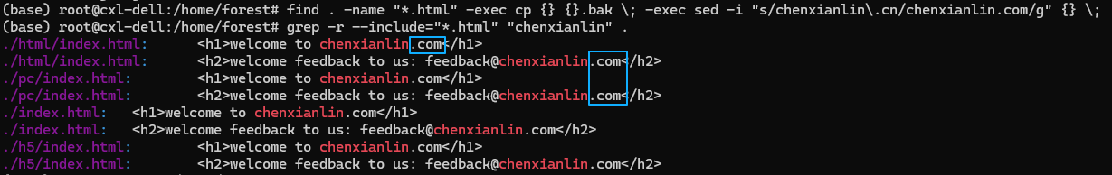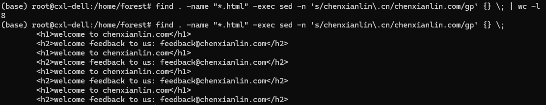 find . -name "*.html" -exec sed -i -E 's/(chenxianlin|www-stream.2345cdn)\.(cn|com|net)/chenxianlin.com/g' {} \;先用grep看下执行之前的数据,再执行替换,我这里只替换当前目录的index.html文件 find . -name "index.html" -exec sed -i -E 's/(chenxianlin|www-stream.2345cdn)\.(cn|com|net)/forest.com/g' {} \;,最终查看结果